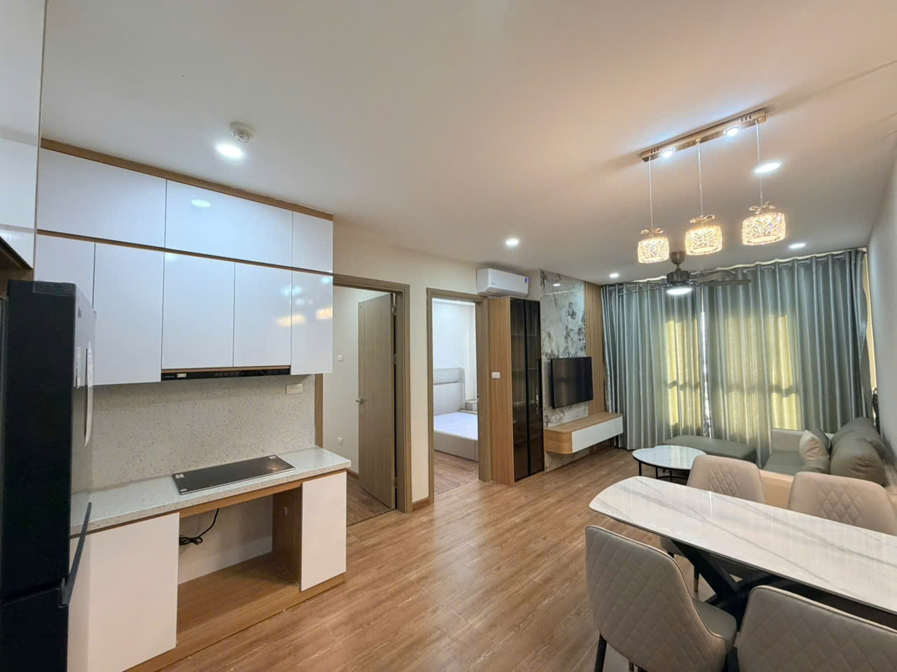Nội thất để lại toàn bộ gồm Tủ bếp, Bếp từ, hút mùi, Điều hòa, nóng lạnh, kệ tivi, tủ gắn tường, đồ điện tử Tivi, máy giặt,…toàn bộ nội thất mới